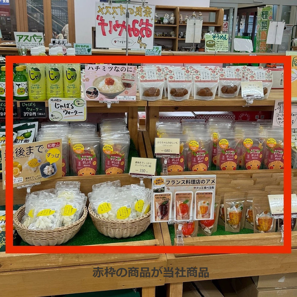 持って行った商品とプライスカードとPOPを陳列したら、さらに販促を強化できるところはないかを考えます。例えば下写真は、先日初めて納品させていただいた当社のコーナーです。3段の什器に陳列した後、上段の上に大きめのパネルが置けるなと思いました。そこで店長さんにご提案すると、設置の御許可をいただいたので、幅800mm×高さ500mmのパネルを現在製作中です。